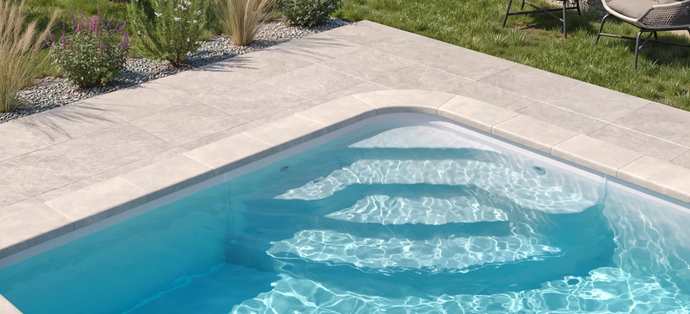 Esthétique et élégant, votre escalier de piscine est disponible en deux finitions : gris et beige, s’adaptant ainsi à tous les environnements.