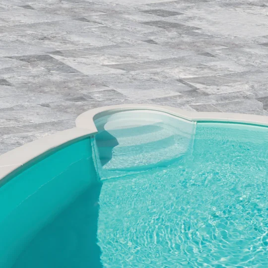 Piscines Waterair vous fournit les plaques de grès cérame grises à installer sur votre escalier Piano que vous pouvez assortir à vos margelles et à votre plage.