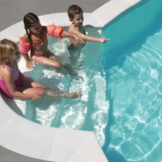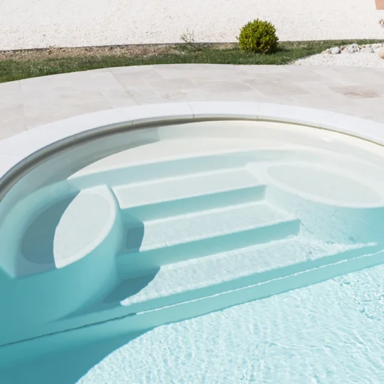 Cet escalier de piscine est proposé en option sur les modèles Tina et Inaya. Pratique, il s’adapte à la profondeur de votre bassin, avec deux ou trois marches qui complètent la banquette immergée de votre piscine. Grâce à lui, vous pouvez plus facilement entrer dans l’eau et installer la couverture de votre piscine. Enfin, il est élégant grâce à ses lignes aériennes, son revêtement en grès cérame et son design minimaliste.