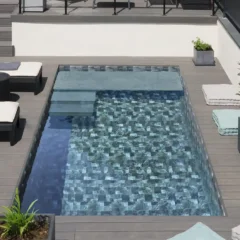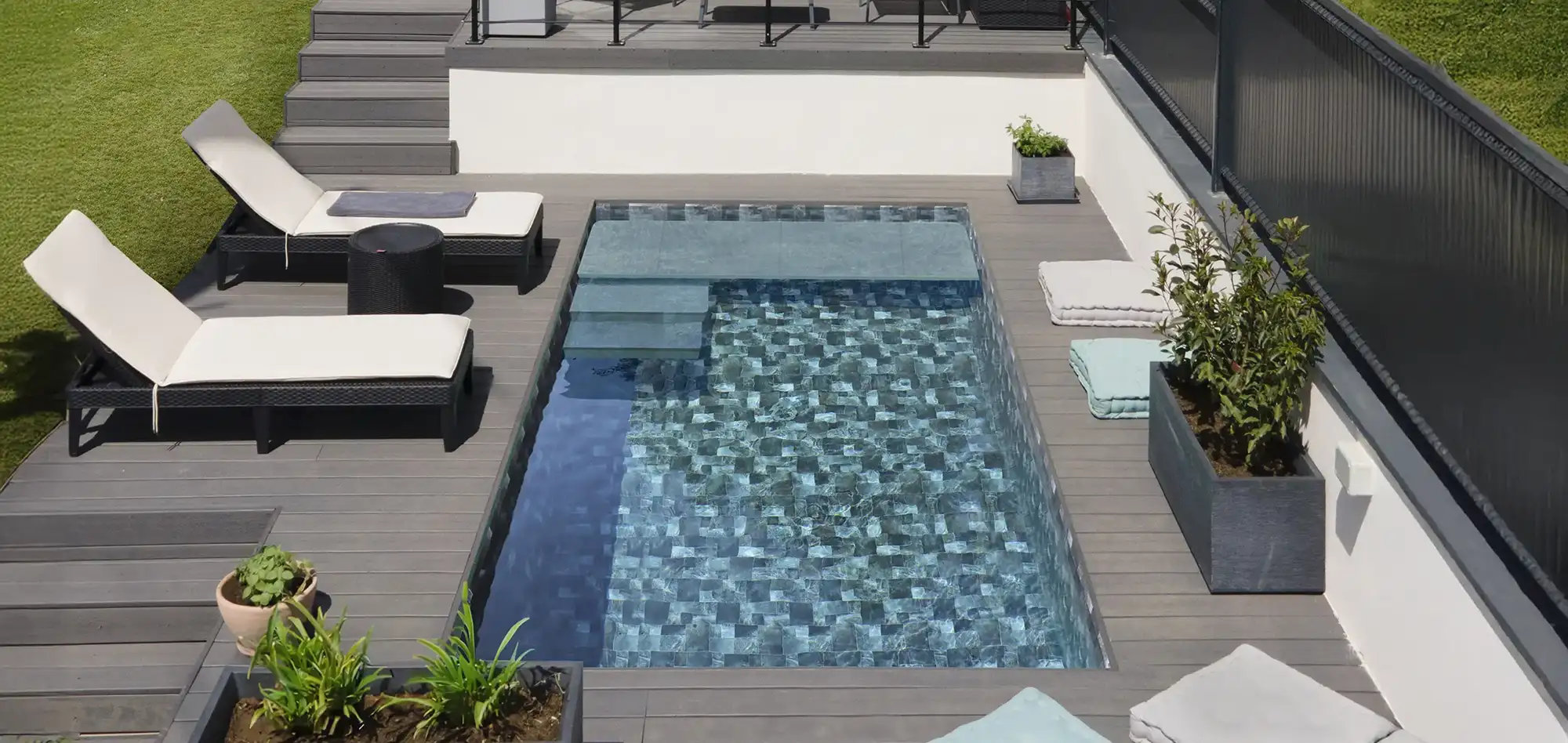Pour encore plus de confort, vous pouvez ajouter l’escalier Piano : ses marches en console au design exclusif Waterair, habillées de grès cérame, offrent une entrée dans l’eau pratique et élégante tout en s’intégrant parfaitement à la ligne du bassin.