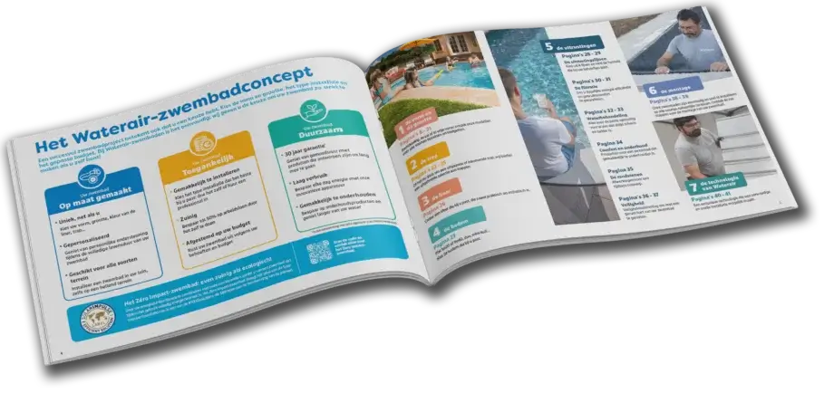 Waterair-uima-allaskuvastosta löydät kaiken tarvitsemasi tiedon unelmiesi uima-altaan toteuttamiseksi. Valintaoppaamme auttaa sinua vaihe vaiheelta pienintä yksityiskohtaa myöten: pohjan muoto ja koko, portaat tai tikkaat, vuorauksen väri, pohjaprofiili, lisävarusteet jne. Mahdollisuuksia omannäköiseesi uima-altaaseen kyllä riittää. Valitset vain mieleisesi!