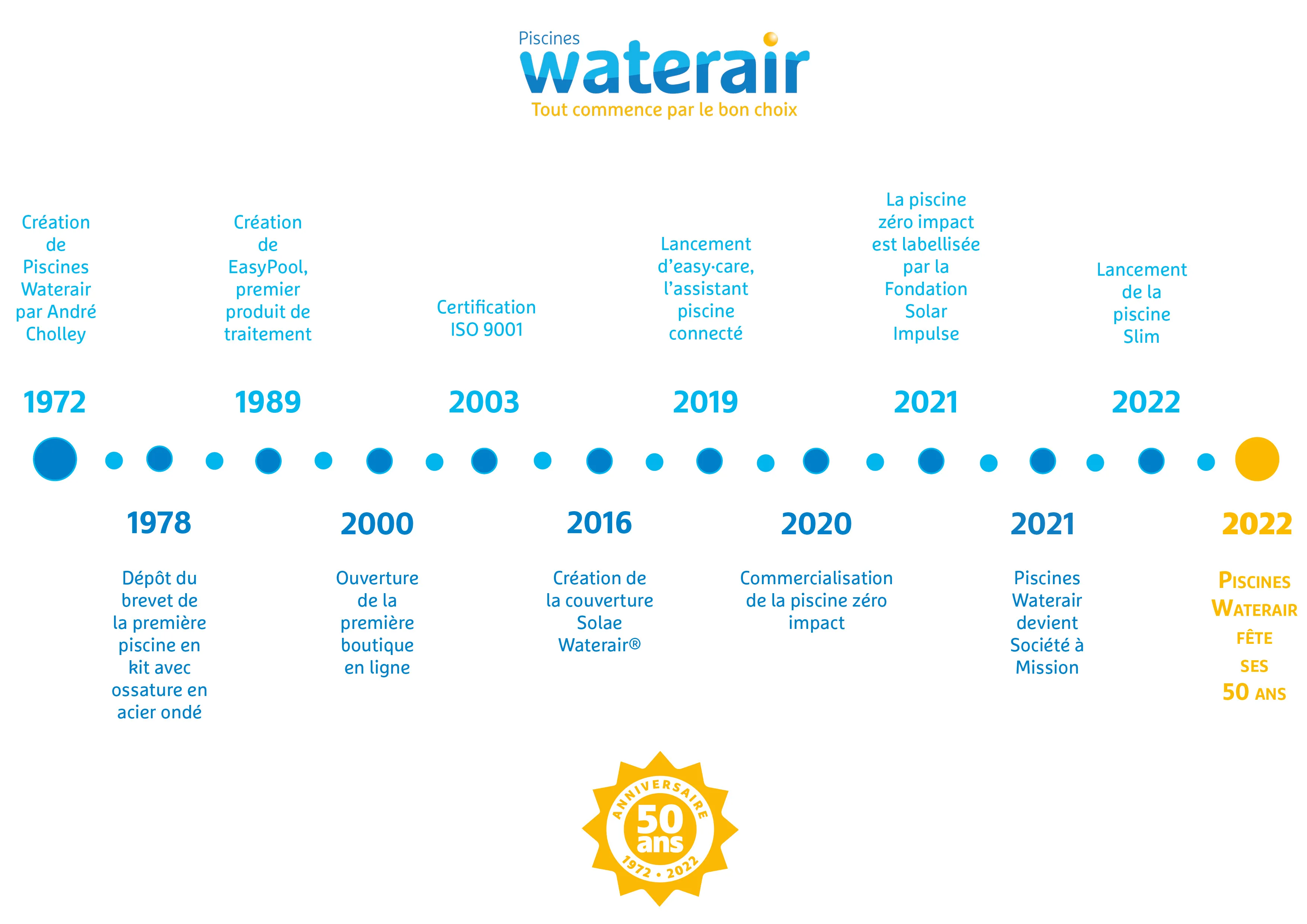 Fondée en 1972, l’entreprise Piscines Waterair célèbre cette année son 50ème anniversaire. Le Groupe alsacien, leader européen de la piscine en kit, a construit son histoire autour d’engagements forts : rendre la piscine accessible au plus grand nombre, s’adapter aux besoins des consommateurs grâce au sur mesure et favoriser une démarche durable au quotidien.