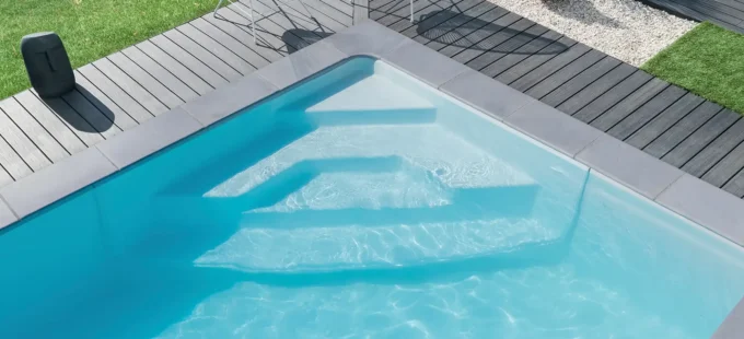 Découvrez notre escalier d’angle Square, exclusivement disponible sur la piscine rectangle Tina. Sa forme triangulaire se marie parfaitement au design de ce modèle tout en alliant confort et praticité.