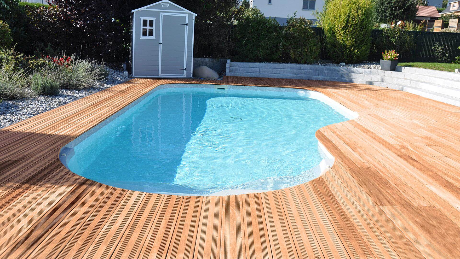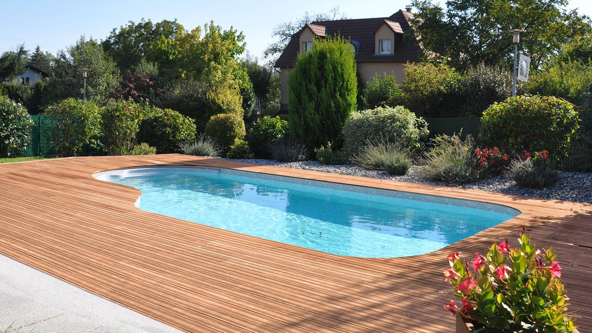 Its elegant inset Pacio steps offer a comfortable spot to unwind. Choose from several liner colours to match your pool to its surroundings: from mint and grey to azure and Tuscan, you're sure to find the perfect hue! Then select the pool floor that fits your needs and preferences: 1.20 m (1.50 m option also available) flat, cove or sport bottom. Whether you enjoy water games, recreational swimming or diving, you'll find the perfect floor for your pool needs.